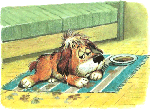 Пошёл Щенок домой мокрый, с распухшим носом. Грустный, улёгся он на коврике около дивана.