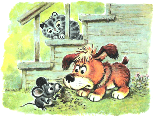 — Мне страшно!  Пи-пи-пи!  — запищал Мышонок и юркнул под крыльцо.