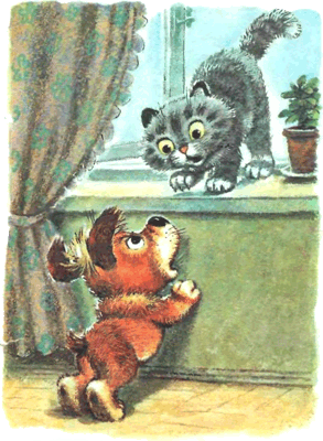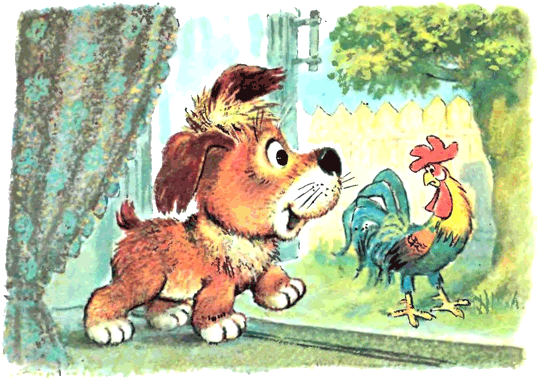 Вскочил Щенок, обежал всю комнату, заглянул под кровать, под стол — никого нет! Влез на подоконник, увидел — за окном во дворе гуляет Петух.