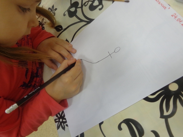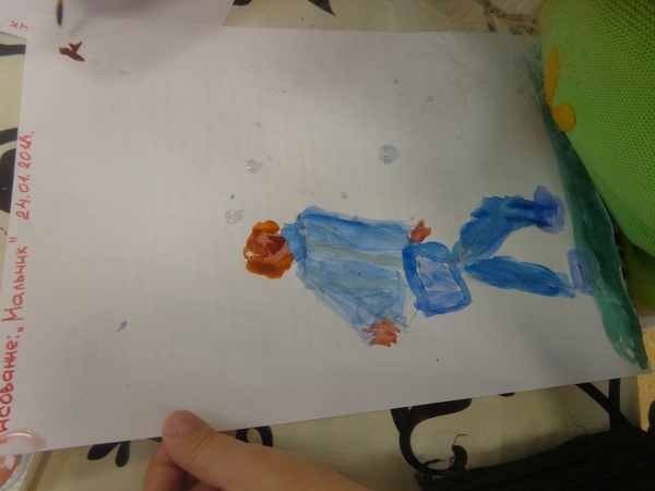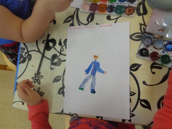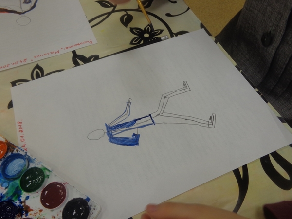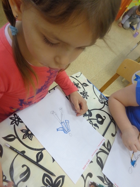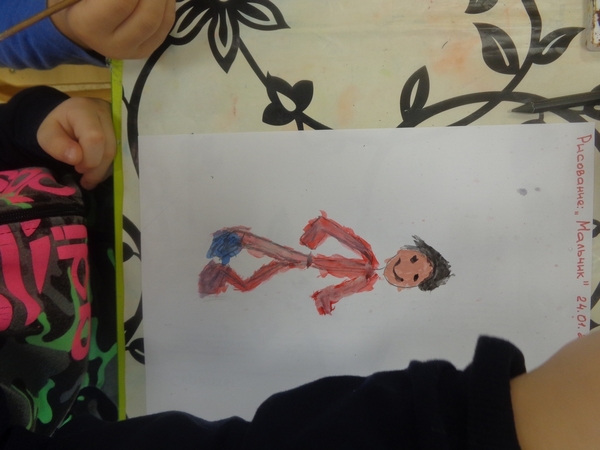 2. Рисуем ноги, согнутые в коленном суставе (все движения показываю на себе, как согнута правая и как согнута левая нога; вызываю ребенка и показываю на нем положение ног)