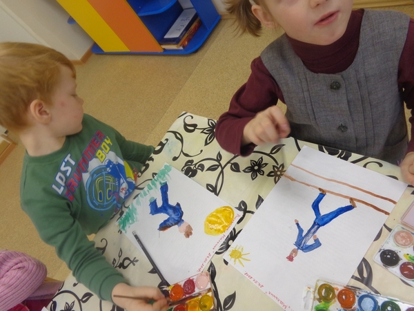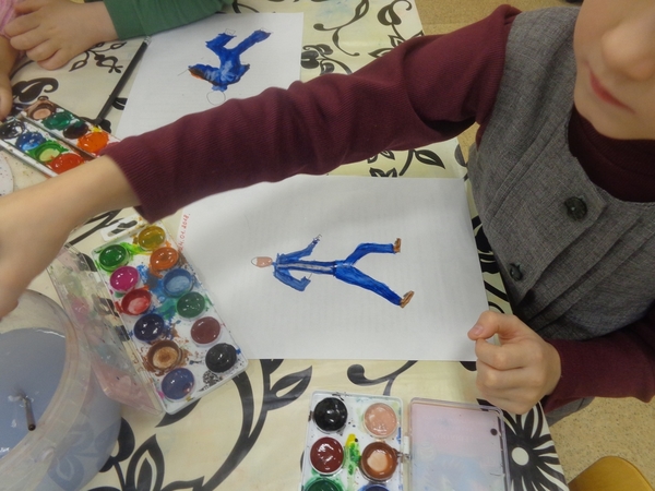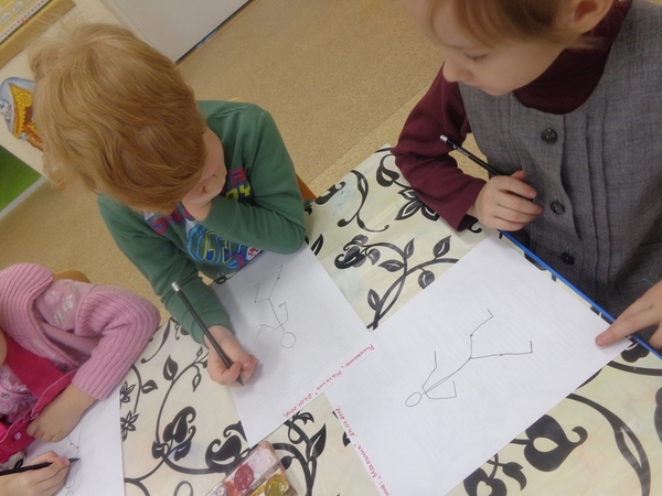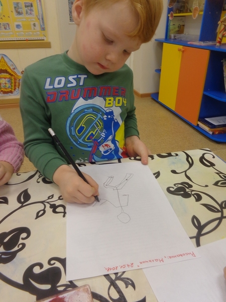 Перед занятием мы рассматриваем иллюстрации человека в движении, провожу игру "Раз, два, три, как человек сидит - покажи " и т.п. Дети выбирают сами - какое движение будет делать "наш человек".