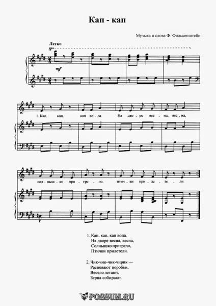 «Чик-чирик» Сл. и муз. Е. Еремеевой Вступление – Дети стоят в кругу, в руках у них птички-оригами. На вступление поднимают руки вверх и качают ими. 1. Чик-чирик, чик-чирик, - Кружатся. Песенка слышна. Эту песню «Чик-чирик» - Выставляют ножки на пяточку. Дарит нам весна. Припев: Птички, птички, к нам летят, - Весь припев бегут по кругу. Крылышками машут. Очень танцевать хотят, С ними мы попляшем. Проигрыш – Останавливаются. Поднимают руки вверх и качают ими. 2. Чик-чирик, стая птиц, - Идут в середину круга, понимают птичек. Прилетела к нам. Песней радуют своей, - Расширяют круг. Наших милых мам. Припев: Весь припев бегут по кругу. Проигрыш - Останавливаются. Поднимают руки вверх и качают ими. 3. Чик-чирик, птички все, - Приседают на корточки, птички «клюют зёрнышки». Зёрнышки клюют. Эти птички, чик-чирик, Песенку поют. Припев: Весь припев бегут по кругу. Проигрыш - Останавливаются. Поднимают руки вверх и качают ими.